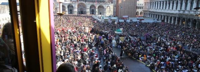 Piazza San Marco durante il Carnevale di Venezia ospita i principali eventi all'aperto rivolti al grande pubblico: la Festa delle Marie, il Volo dell’Angelo, le grandi sfilate di maschere, le rievocazioni storiche. Tra un ballo a palazzo e un ricevimento in maschera, il Carnevale è anche un’immersione nella folla.